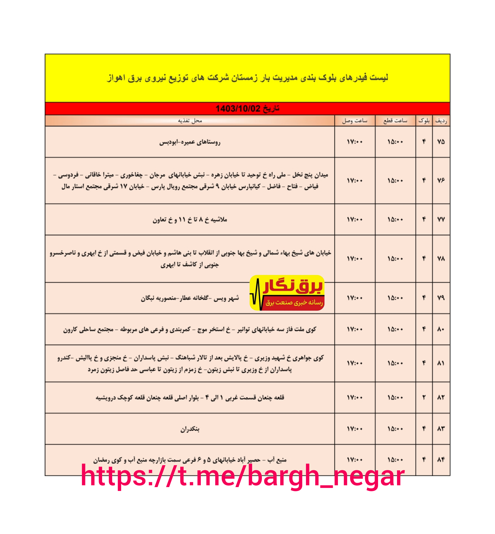 جدول خاموشی استان خوزستان برای روز یکشنبه دوم دی ماه