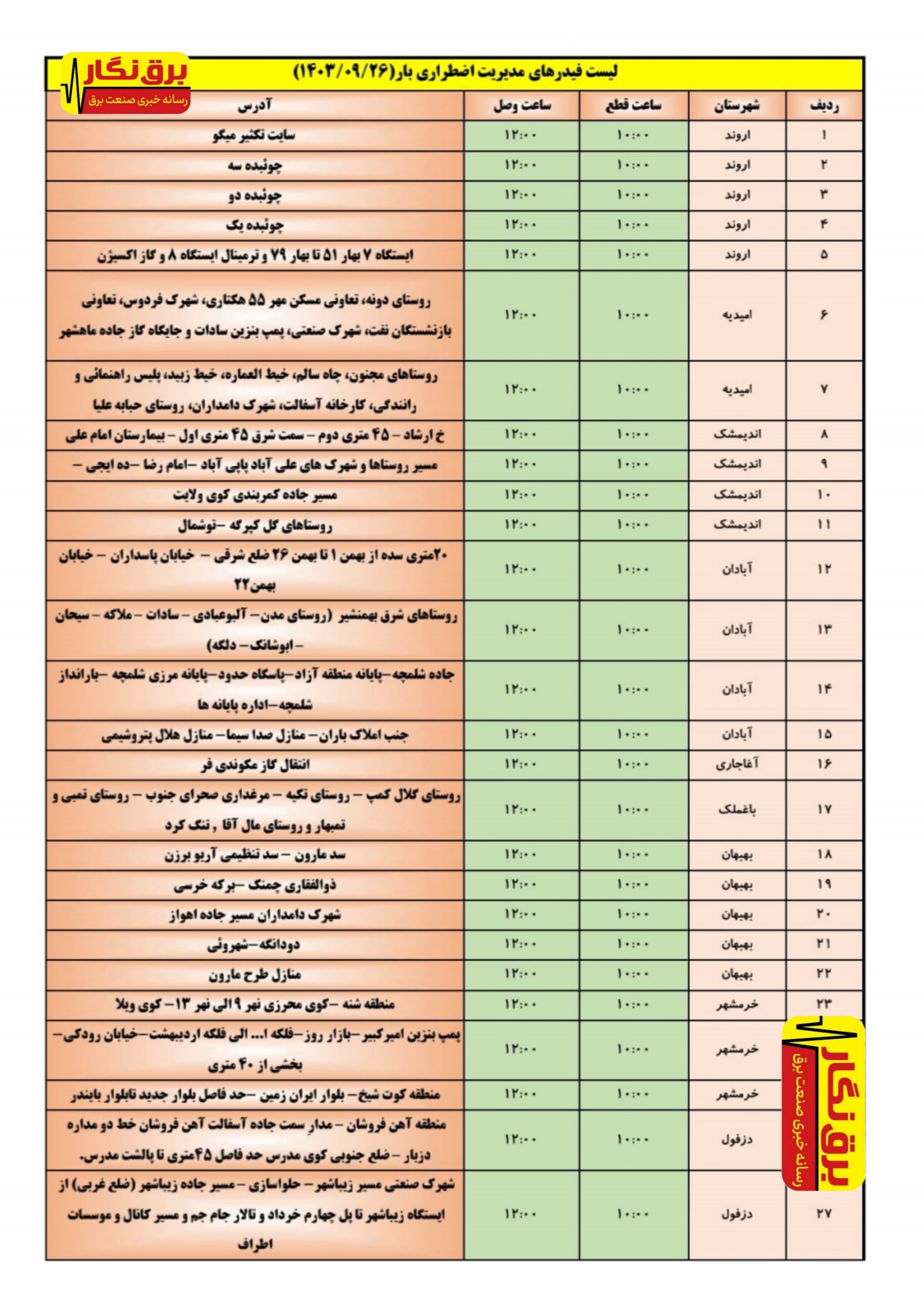 جدول خاموشی استان خوزستان برای روز دوشنبه اعلام شد